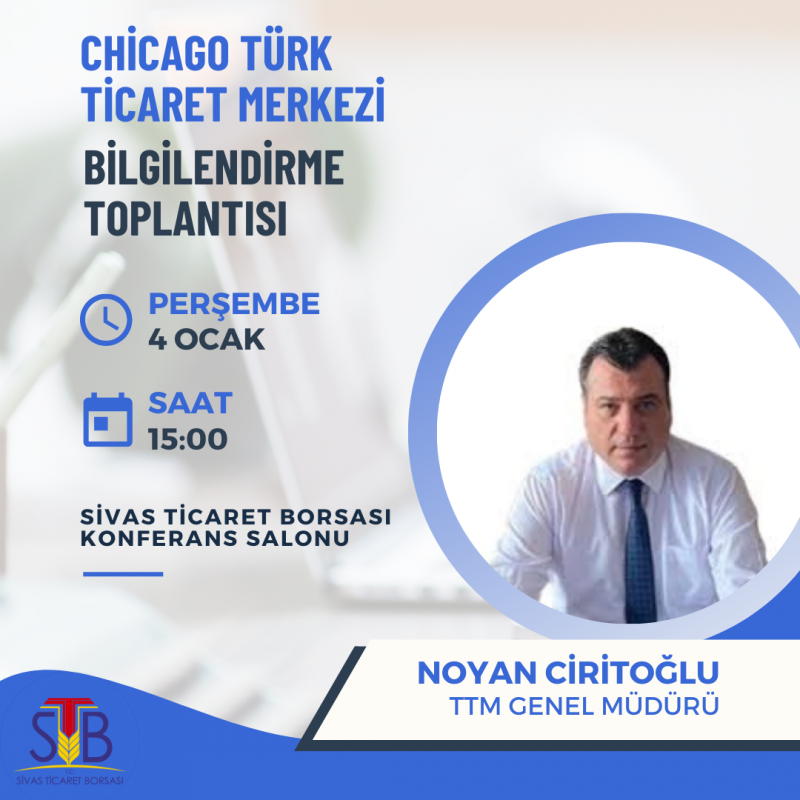 T.C. Ticaret Bakanlığı desteği ile TOBB tarafından ABD'nin en önemli ticaret ve lojistik merkezlerinden Chicago'da kurulan Türkiye Ticaret Merkezi (TTM) ile ilgili bilgilendirme toplantısı 4 Ocak 2024 Perşembe günü Saat 15:00 de Borsamızda düzenlenecektir.