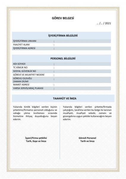 Başvuruda bulunan çalışana dair kimlik bilgilerinin yanı sıra sokağa çıkma kısıtlaması sırasında hangi amaçla işyerinde olması gerektiği, çalışma süresi/zaman dilimi, işyeri ve ikamet adresi, varsa kullanacağı servis ya da araç plaka bilgisinin de yer alacağı görev belgesinin çıktısı başvuruda bulunan kişi tarafından alınarak işyeri/firma yetkilisine imzalatılacak.
